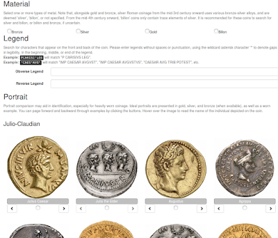 The interface, called "Identify a Coin", is a simplification of OCRE's browse interface into the basic components that can help to narrow down a coin's visibly identifiable attributes. Selection to specific criteria leads the user into a restricted subset of matches for further comparison (aided by the great number of images associated with coin types provided by Nomisma.org partner institutions). For example, a user of this interface can select the type of metal and insert any recognizable characters on either the obverse or reverse legend, with wildcards ('*' characters) designating gaps in legibility. Importantly, the user can select from a nearly complete list of imperial portraits as potential matches. The portraits are listed chronologically, first by dynasty, and then by personage within the dynasty (including empresses and children). In many cases, portrait images are available in gold, silver, and bronze, as well as worn examples that one may encounter with stray finds or excavation. The selection of a material will automatically change the metal of the portraits, when a relevant image is available. More than one material may be chosen, which is useful for later Roman coinage, when severe wear makes it difficult to distinguish between what RIC has designated as "silver," "bronze," or "billon." By clicking the left and right arrows below the image, it is possible to scroll through available portraits, which may show several phases of portraiture, such as Nero, who grew from a teenager into adulthood over the course of his reign.