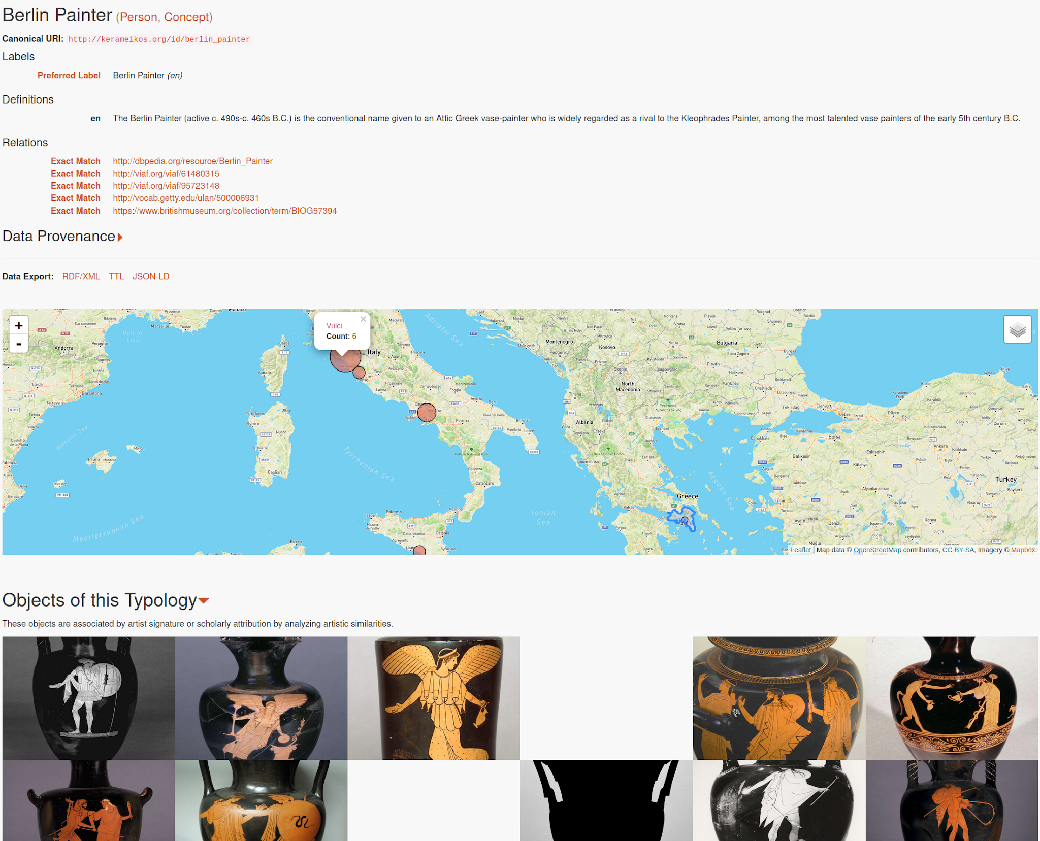 A large quantity of relevant painters and potters (about 300) have been published to Kerameikos.org in recent months. While work remains to create URIs and definitions for the remaining notable Classical Red-figure painters and to fill in the gaps of relatively non-notable entities from the Beazley Archive Pottery Database vocabularies, the number of artists that exist as entities within the Kerameikos LOD ecosystem is great enough to begin the process of aggregating open access museum collections.